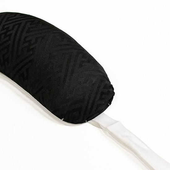 縦7.5cm×横20.5cm×厚み4.5cm スタンダードといえるサイズです。こちらは黒地に紗綾形紋の地紋が入っている弔事向きの帯枕です。お着物では「見えないところにもお洒落心を…」といわれます。また慶事と不祝儀で和装小物を使い分ける方もいらっしゃいます。こだわりの黒地帯枕を使われてみては如何でしょう。