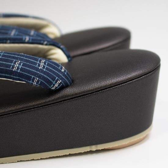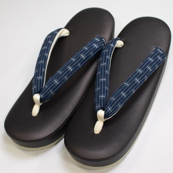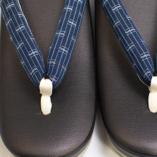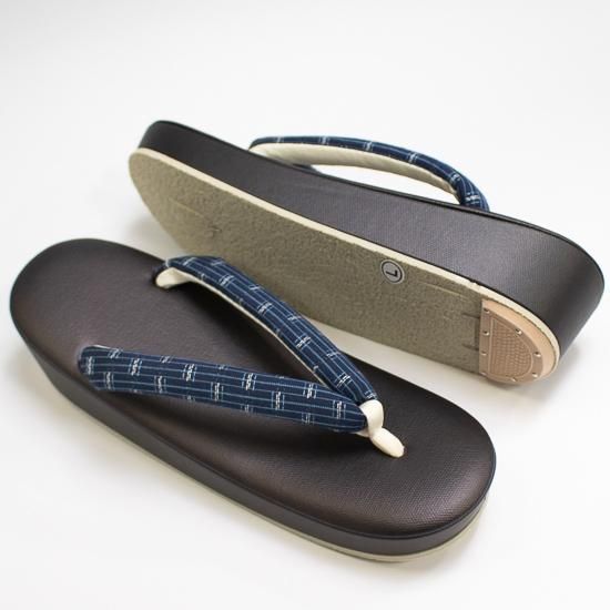 シックな茶系の帆布生地の一枚芯の草履台に、キリッとした紺系の鼻緒が挿げられた草履です。落ち着いた色合いでまとめられており、カジュアル感のある小紋や紬、普段使いの木綿やウールにもおすすめの草履です。 丈夫で耐久性のある帆布は水にも強く、草履の底面はすべりにくいゴム素材となっています。鼻緒の裏地は起毛素材が使われており、足にあたる感触もソフトです。ふんわりしたやわらかな履き心地で、長時間のお出掛けでも安心して着用して頂けます。