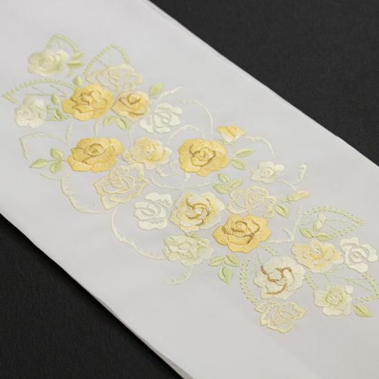 衿元に華やかさ、豪華さ、明るさを与え、顔映りの印象を引き立ててくれる刺繍半衿。様々な地色をベースにした華やかな刺繍を施したものは、主に華やかなお着物で活躍してくれます。こちらは白色にお洒落で上品なバラの文様の刺繍の半衿です。しっかりした刺繍で襟元に華やかさと派手さを加えることができるでしょう。おすすめのお着物は訪問着、付け下げ、色無地、振袖です。