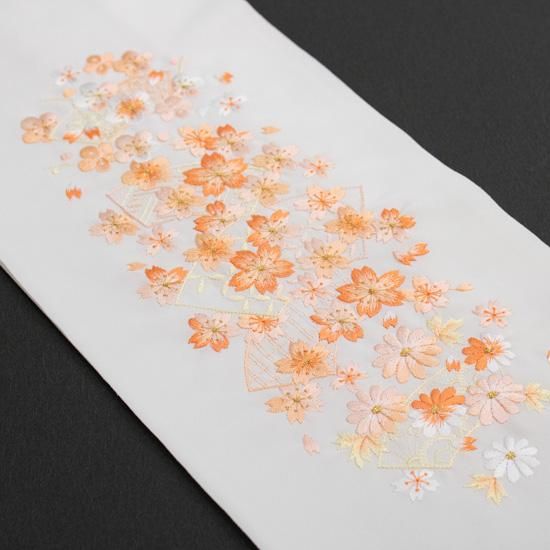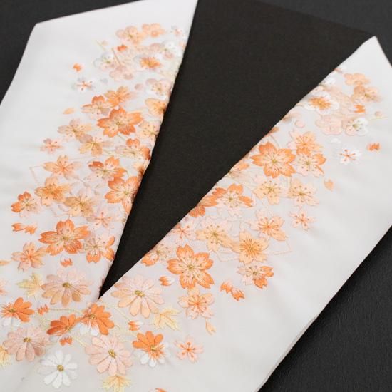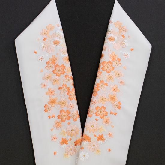 衿元に華やかさ、豪華さ、明るさを与え、顔映りの印象を引き立ててくれる刺繍半衿。様々な地色をベースにした華やかな刺繍を施したものは、主に華やかなお着物で活躍してくれます。こちらは白色に上品な桜、梅、菊の刺繍の半衿です。しっかりした刺繍で襟元に華やかさと派手さを加えることができるでしょう。おすすめのお着物は訪問着、付け下げ、色無地、振袖です。