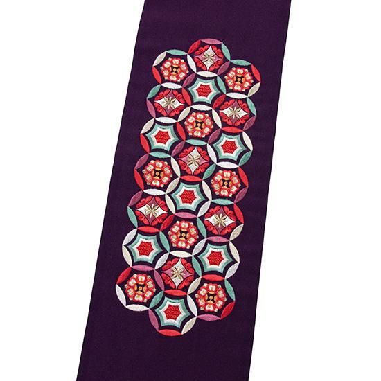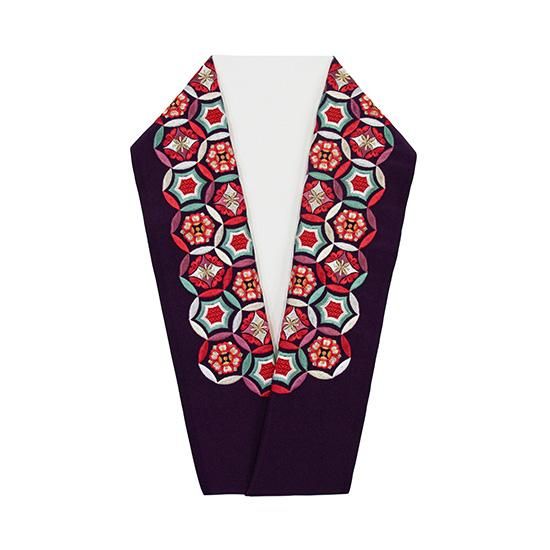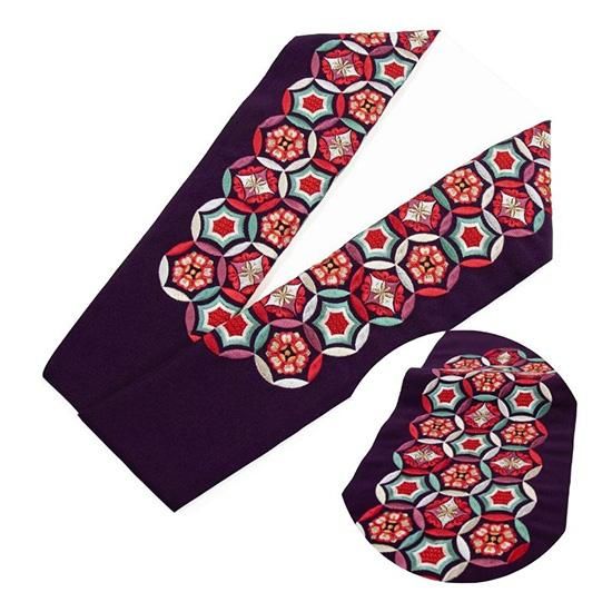 衿元に華やかさ、豪華さ、明るさを与え、顔映りの印象を引き立ててくれる刺繍半衿。様々な地色をベースにした華やかな刺繍を施したものは、主に振袖や華やかなお着物で活躍してくれます。こちらは紫地に華やかな刺繍の半衿です。縁起の良い七宝文様です。しっかりした刺繍で襟元に豪華さと派手さを加えることができるでしょう。おすすめのお着物は振袖、訪問着(付け下げ)です。