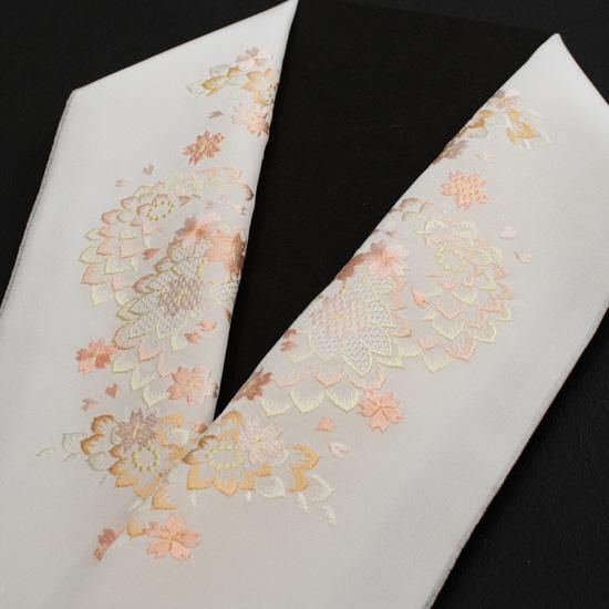 衿元に華やかさ、豪華さ、明るさを与え、顔映りの印象を引き立ててくれる刺繍半衿。おすすめのお着物は訪問着、付け下げ、色無地、振袖です。