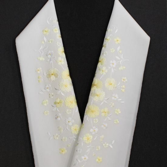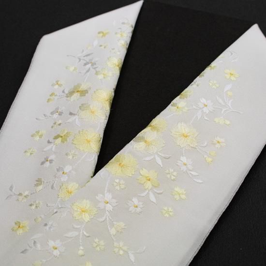 衿元に華やかさ、豪華さ、明るさを与え、顔映りの印象を引き立ててくれる刺繍半衿。おすすめのお着物は訪問着、付け下げ、色無地、振袖です。