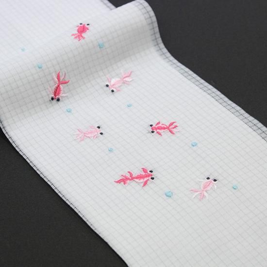 サラリとした涼しげな格子絽の夏半衿です。顔映りの印象を引き立ててくれるさわやかな刺繍半衿。素材はお手入れもしやすいポリエステルです。気軽に使えるお洒落夏半衿として惜しげなくお楽しみください。