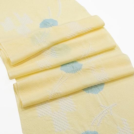 センスあふれる魅力的な小物を創作する襟の衿秀。上質な生地にきらきら光るラメと絞りを施した帯揚げです。明るくさわやかなクリームイエローのお色は帯周りをお洒落なアクセントで彩ります。