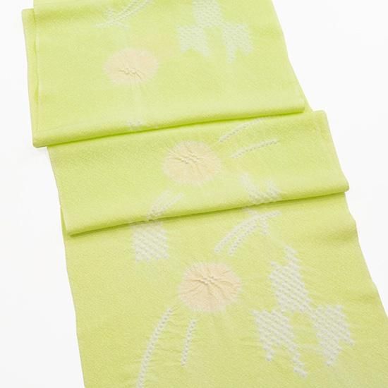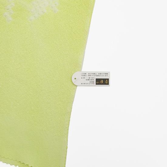 センスあふれる魅力的な小物を創作する襟の衿秀。上質な生地にきらきら光るラメと絞りを施した帯揚げです。明るくさわやかなライムグリーンのお色は帯周りをお洒落なアクセントで彩ります。