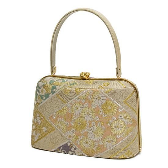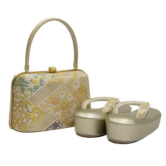 バッグは装飾された金フレームに西陣織の帯地を使い、華やかながら上品さのあるコーディネートしやすいデザインです。草履は天芯に新素材を使い、足あたりの良い心地よいフィット感の低反発台を使用しています。やわらかクッションは快適な履き心地で足元をサポートします。