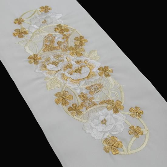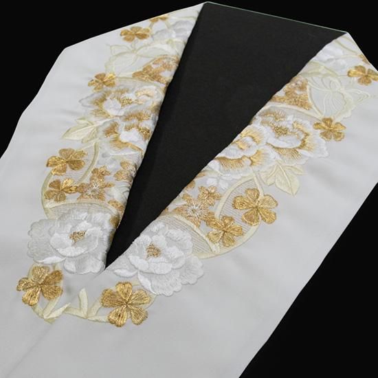 衿元に華やかさ、豪華さ、明るさを与え、顔映りの印象を引き立ててくれる刺繍半衿。様々な地色をベースにした華やかな刺繍を施したものは、主に振袖や華やかなお着物で活躍してくれます。 こちらは白地に白金刺繍の半衿です。縁起の良い七宝牡丹桜蝶の文様は幸せを願った吉祥文様です。しっかりした刺繍は襟元に豪華さと品格を加えます。おすすめのお着物は振袖、訪問着、付け下げです。