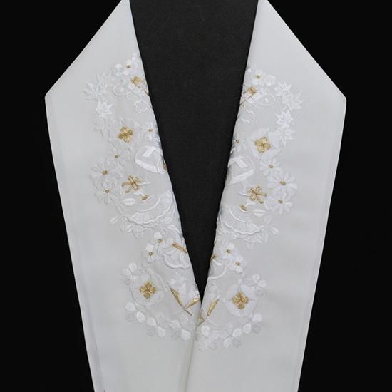 衿元に華やかさ、豪華さ、明るさを与え、顔映りの印象を引き立ててくれる刺繍半衿。白地をベースにした白・金・銀の刺繍を施したものは、フォーマル、セミフォーマルのお着物で活躍してくれます。 こちらは白地に白金刺繍の半衿です。縁起の良い宝尽くし文様は福徳を呼ぶ吉祥文様です。しっかりした刺繍で襟元に豪華さと品格を加えます。おすすめのお着物は留袖、訪問着、付け下げです。