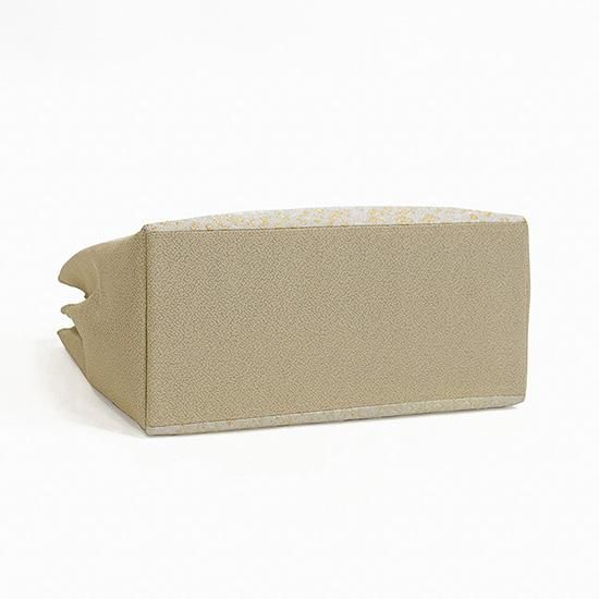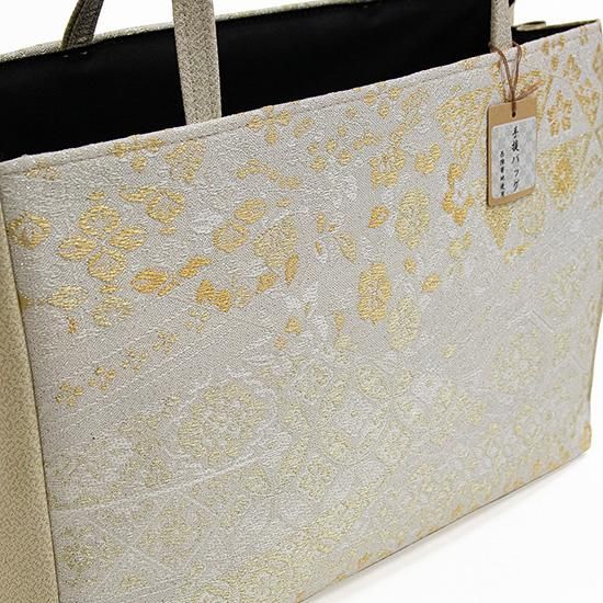 上品で華やかな西陣帯地を使用した和装手提げバッグです。マチもたっぷりA4が収納できる大きさでお荷物が多いときにも安心の大容量サイズです。内側サイドにポケット。中央にはファスナー付きの中仕切りがあるので、貴重品などの収納にも便利です。結婚式や入学・卒業式などの装いはもちろん、お茶席や趣味のお出かけなど幅広いシーンでお使いいただきたいバッグです。