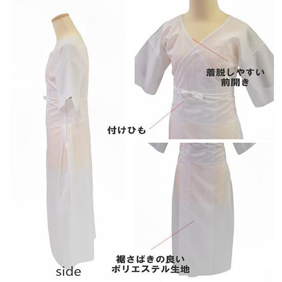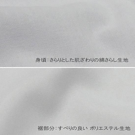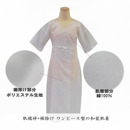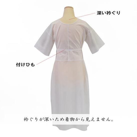 肌着と裾除けが一体化したワンピース型の和装スリップです。身頃はさらりとした綿の晒生地、裾部分はすべりの良いポリエステル生地を使用しています。着用は前開きタイプで、セットした髪も崩さず、簡単に着付けることが可能です。初心者の方にもおすすめのワンピースの和装スリップです。