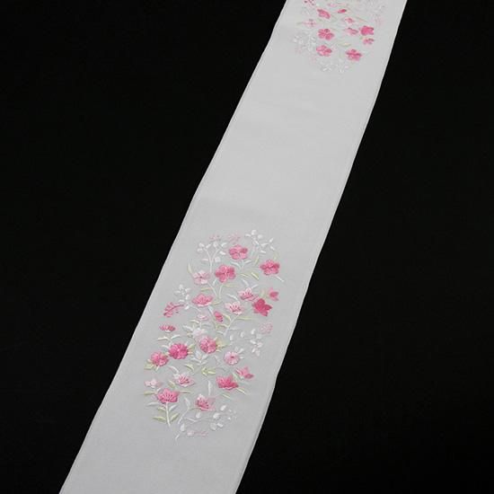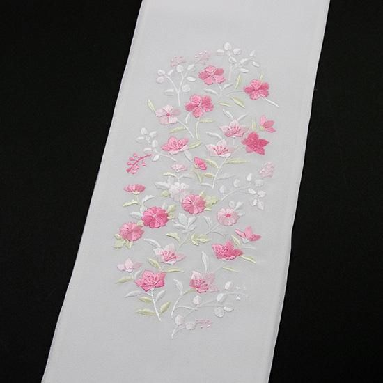 衿元に華やかさ、豪華さ、明るさを与え、顔映りの印象を引き立てる刺繍半衿です。古典的な花柄の模様の上品な刺繍が、着物の華やかさを一段と際立たせます。おすすめの着物は訪問着、付け下げ、色無地、振袖です。