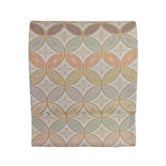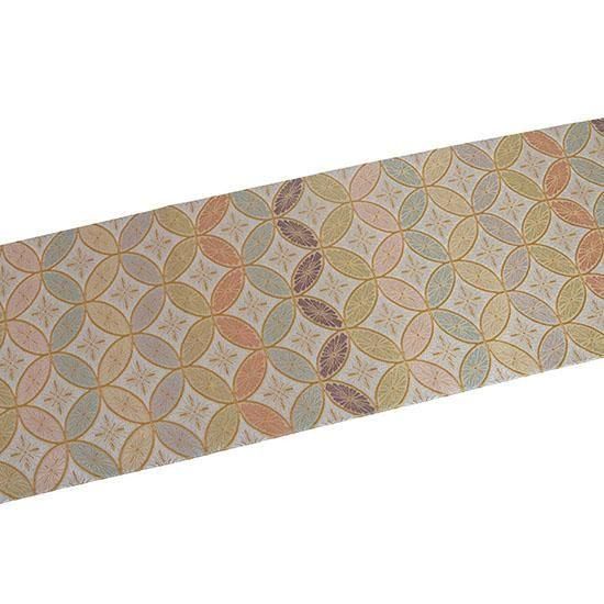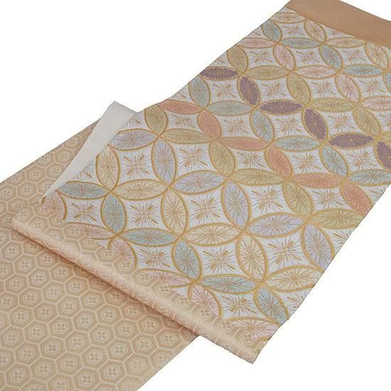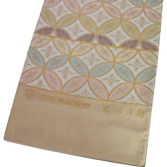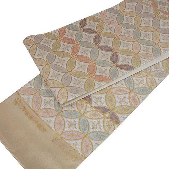 伝統に培われた洗練された意匠にファンも多い西陣名門ブランド河合美術織物の袋帯です。上品で華やかな菊七宝唐花文が素敵な一品です。「能寿菊七宝唐花文」は、古来より吉祥を象徴する伝統文様です。長寿と気品をあらわす“菊文”に、永遠の調和とご縁の広がりを表す“七宝文”を重ね、“繁栄と幸福”への願いが込められています。飽きのこないシンプルなデザインで、西陣の名門ならではの繊細な織と洗練された意匠が華やかさと品格を一層引き立てる袋帯です。