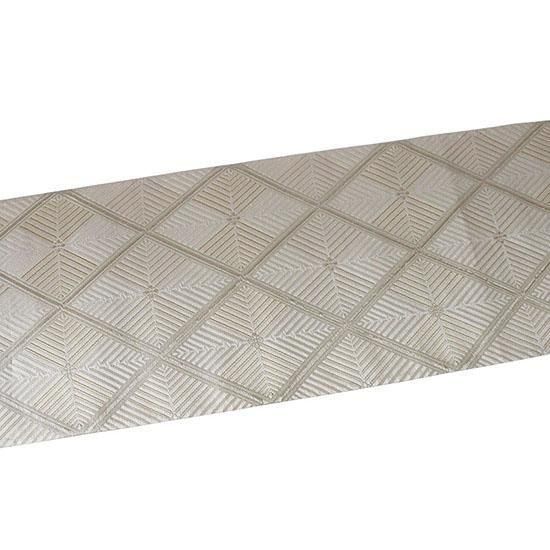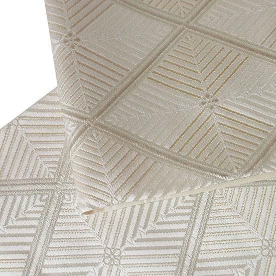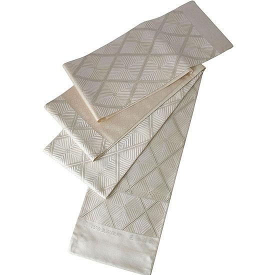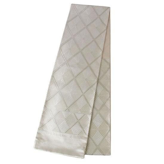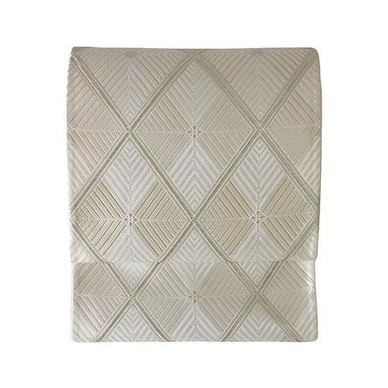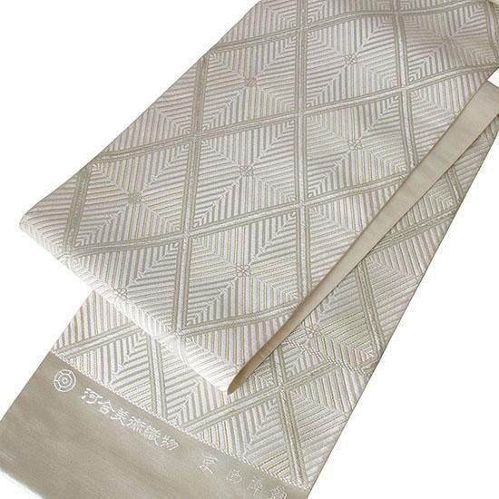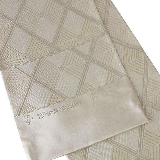 伝統に培われた洗練の意匠で多くのファンを魅了する、西陣の名門「河合美術織物」による袋帯です。上品で気品あふれる「能寿七宝菱松文」が織り出された、格調高い逸品です。「格子若松菱文」は、規則正しく重なり合う格子が安定と調和を象徴し、成長・希望・新たな門出を意味する若松文と組み合わされ、四方へ広がる菱文の形には発展と繁栄への願いが込められた吉祥文様です。若松の瑞々しさと格子の安定感を併せ持つ伝統文様は、規律ある構図が美しく調和し、上品で落ち着いた印象を与えます。白・金・銀糸を基調に織り上げられた帯は、凛とした格調と柔らかな華やぎを併せ持ち、晴れの日の装いをいっそう美しく引き立てます。